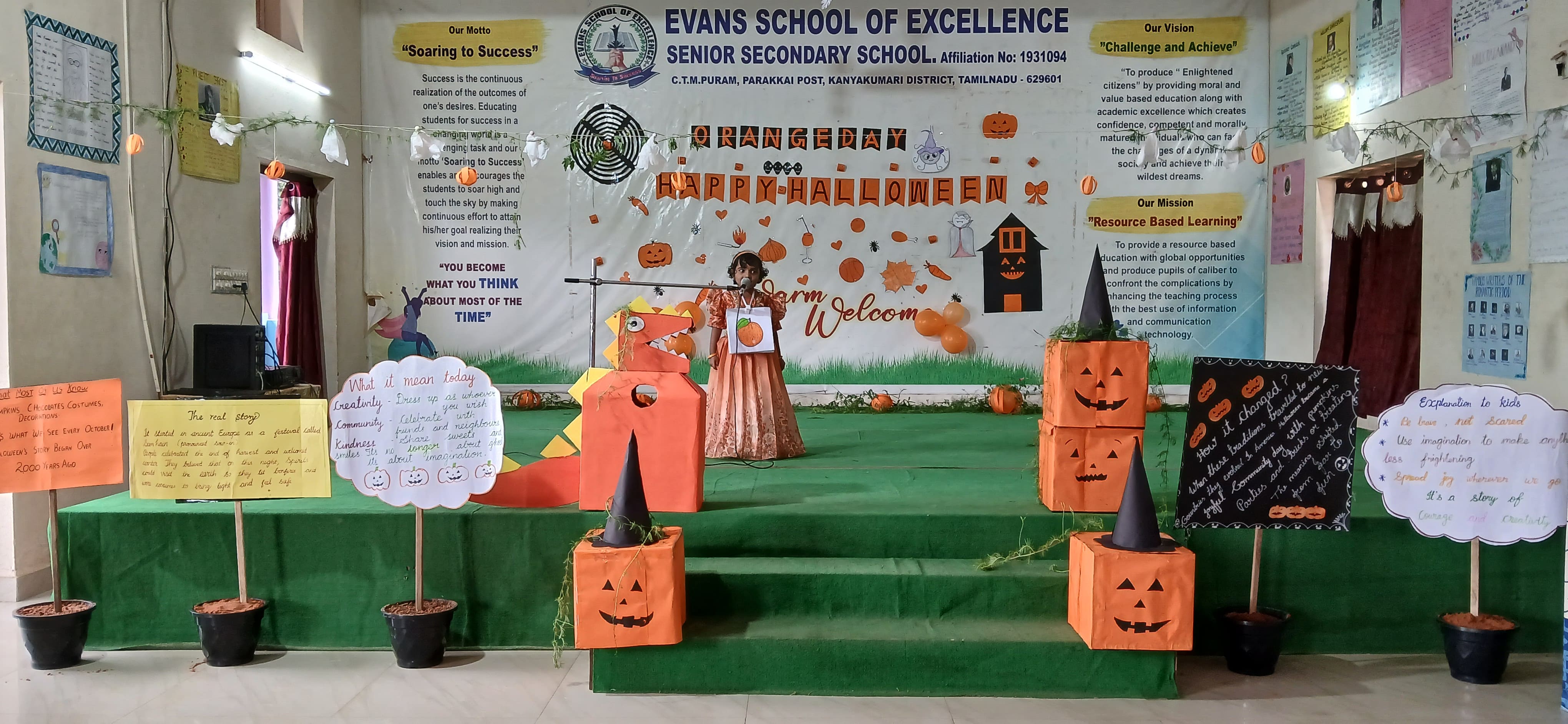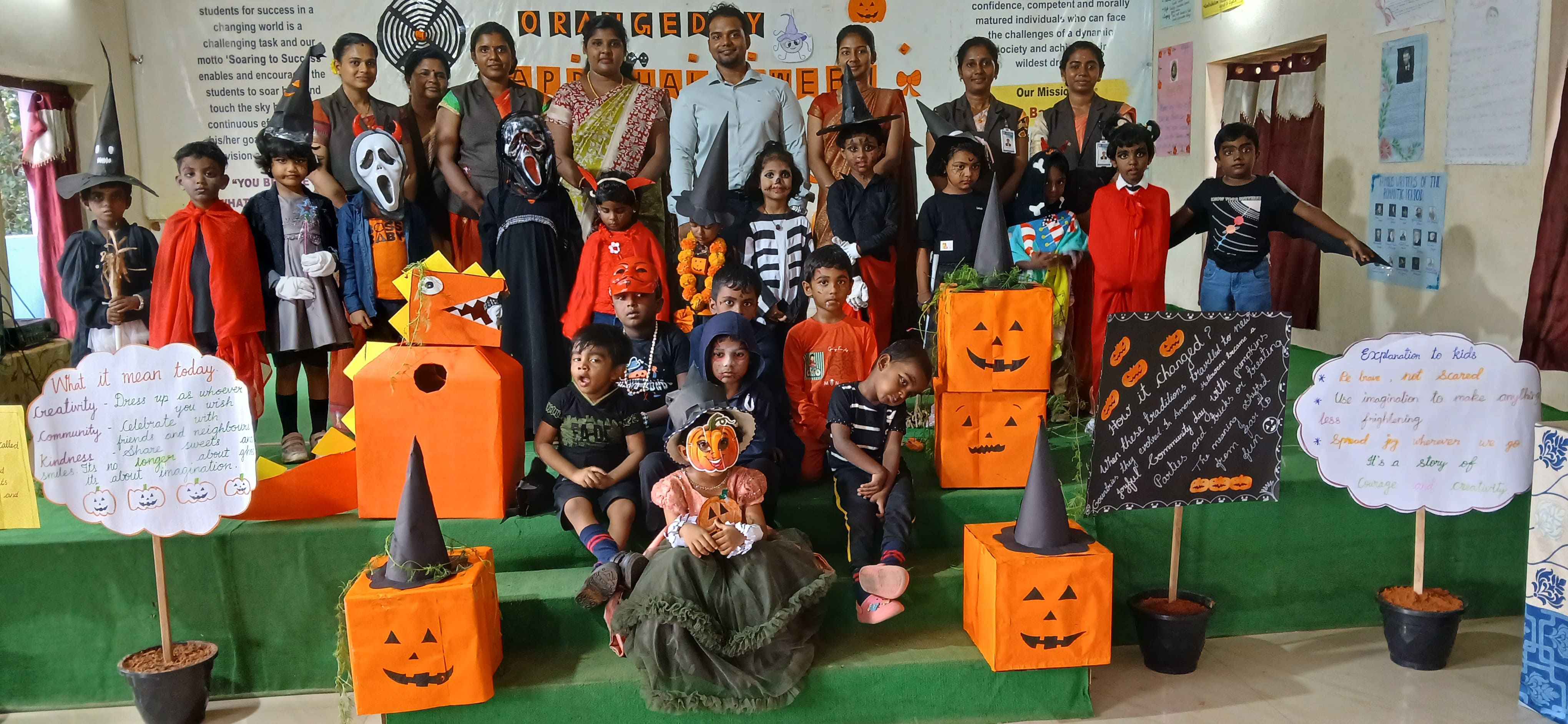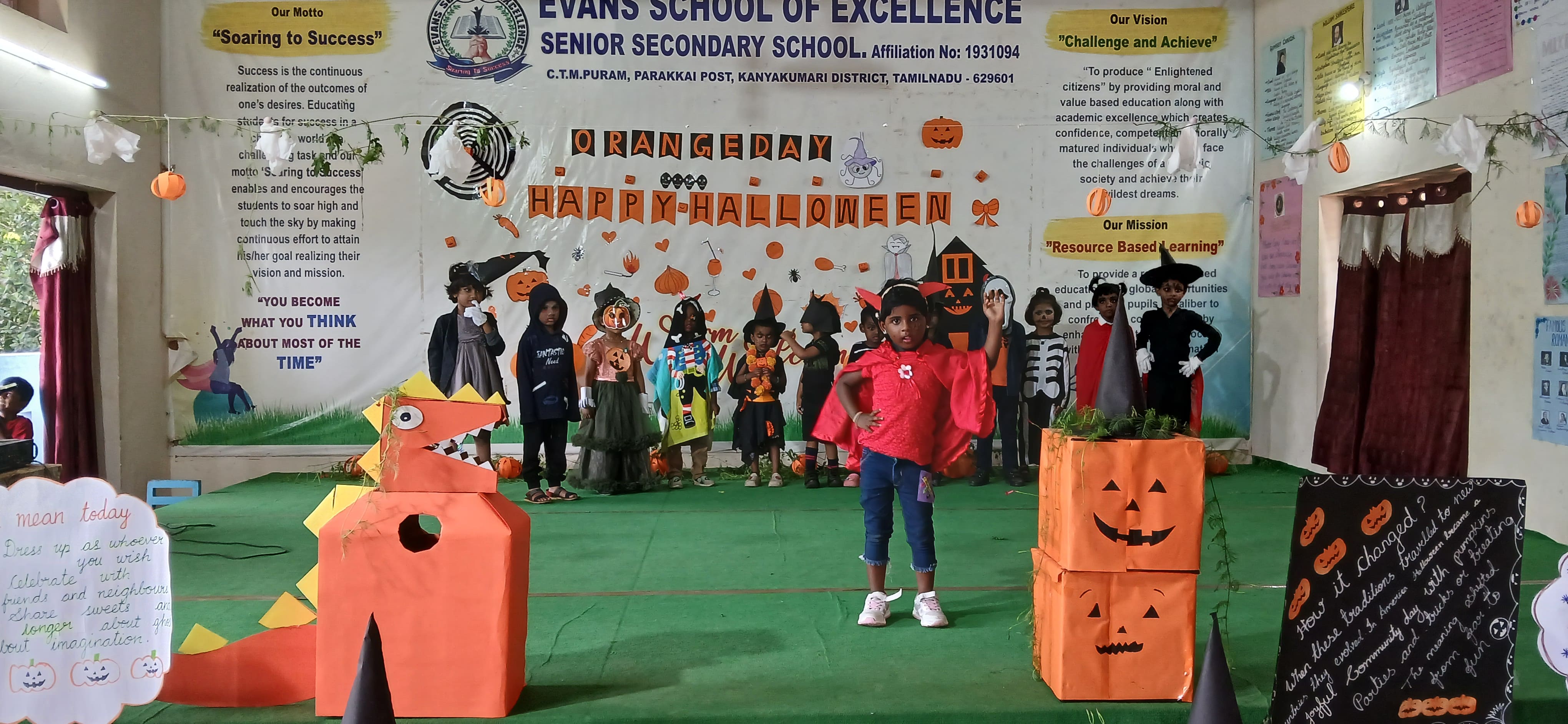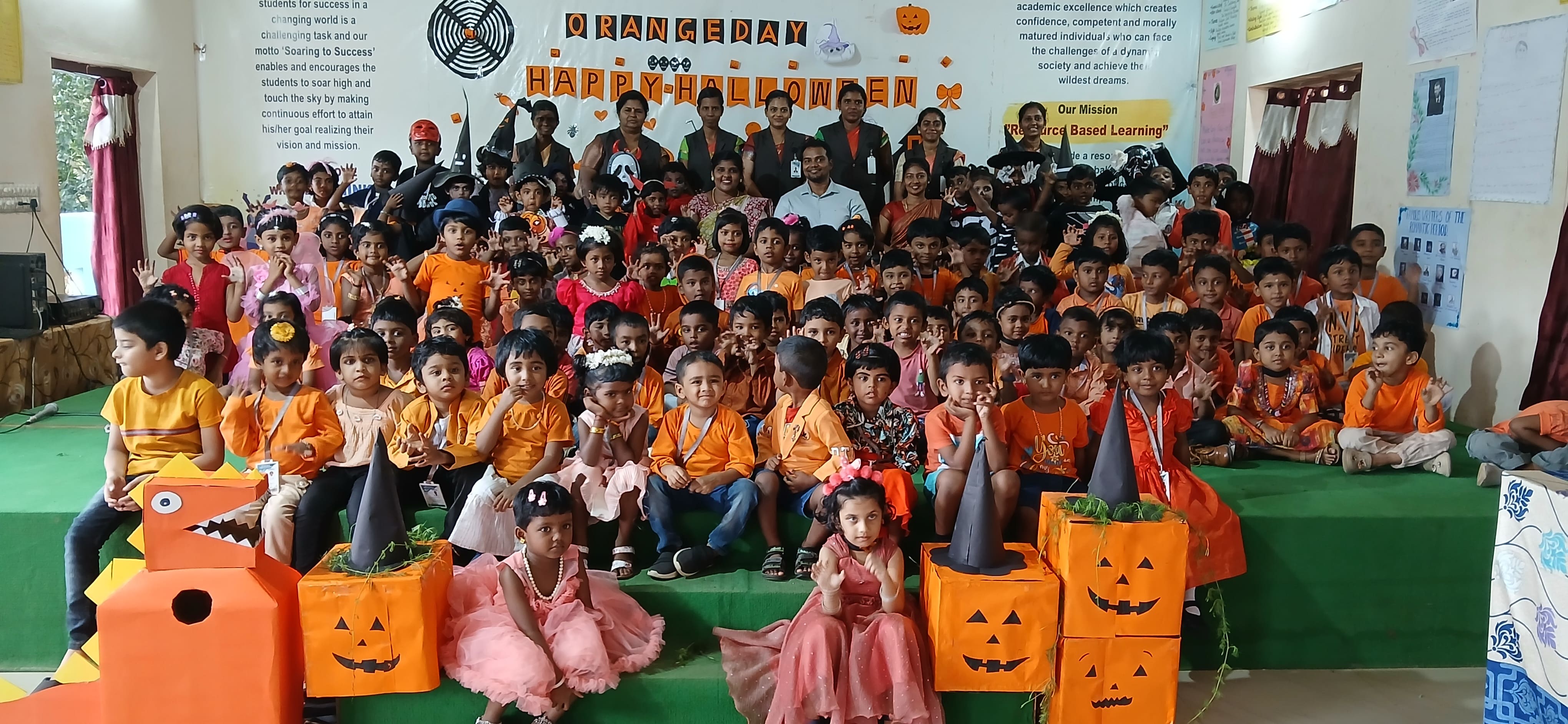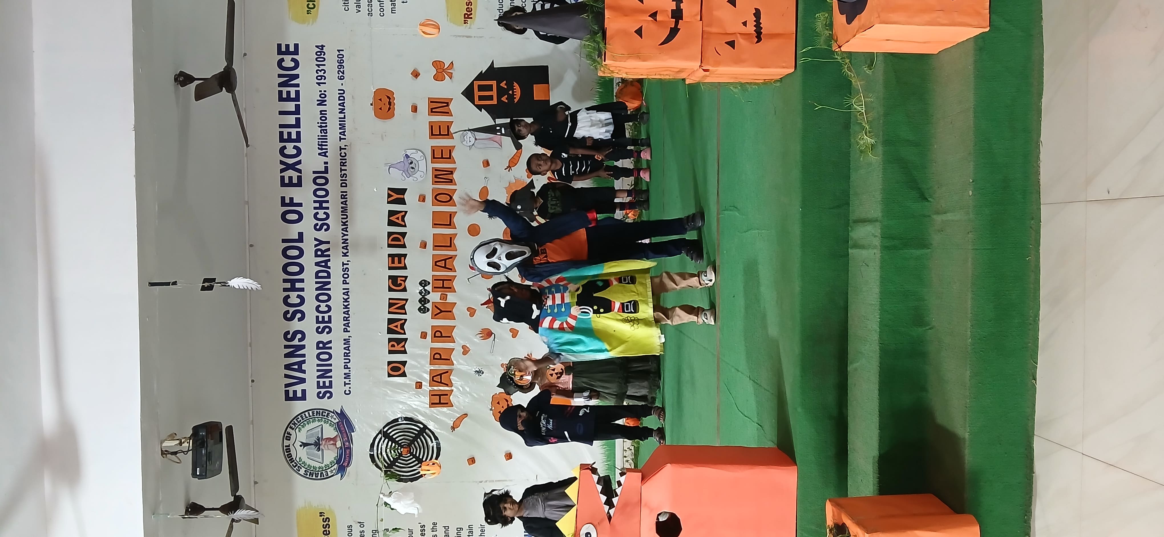 "The Colour of Sunshine and smiles took over as our little Evansians celebrated Orange Day"&"Bag of sweets,ghosts are walking down the street"