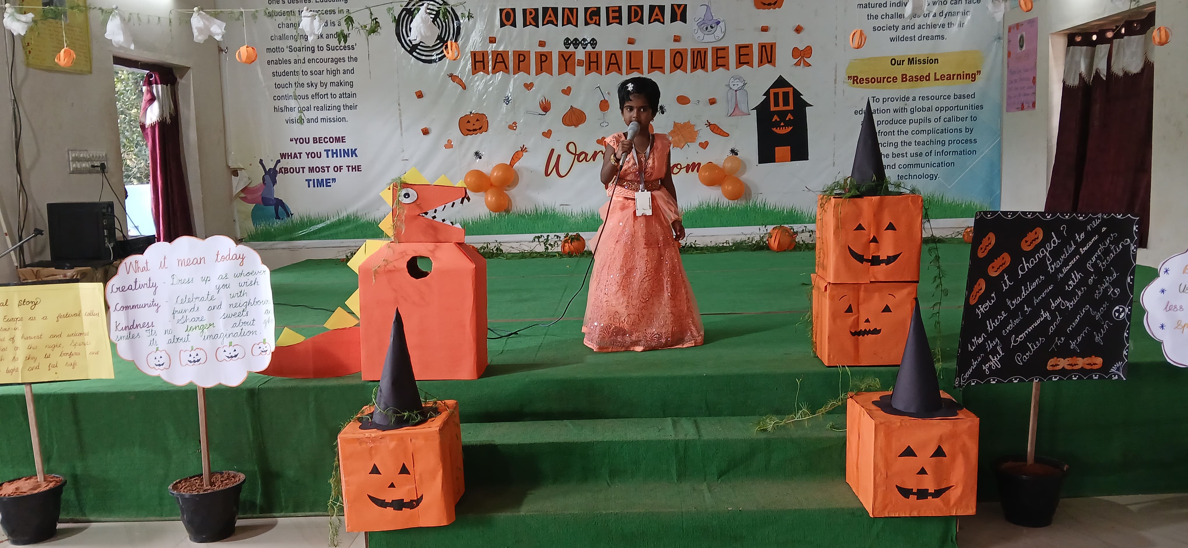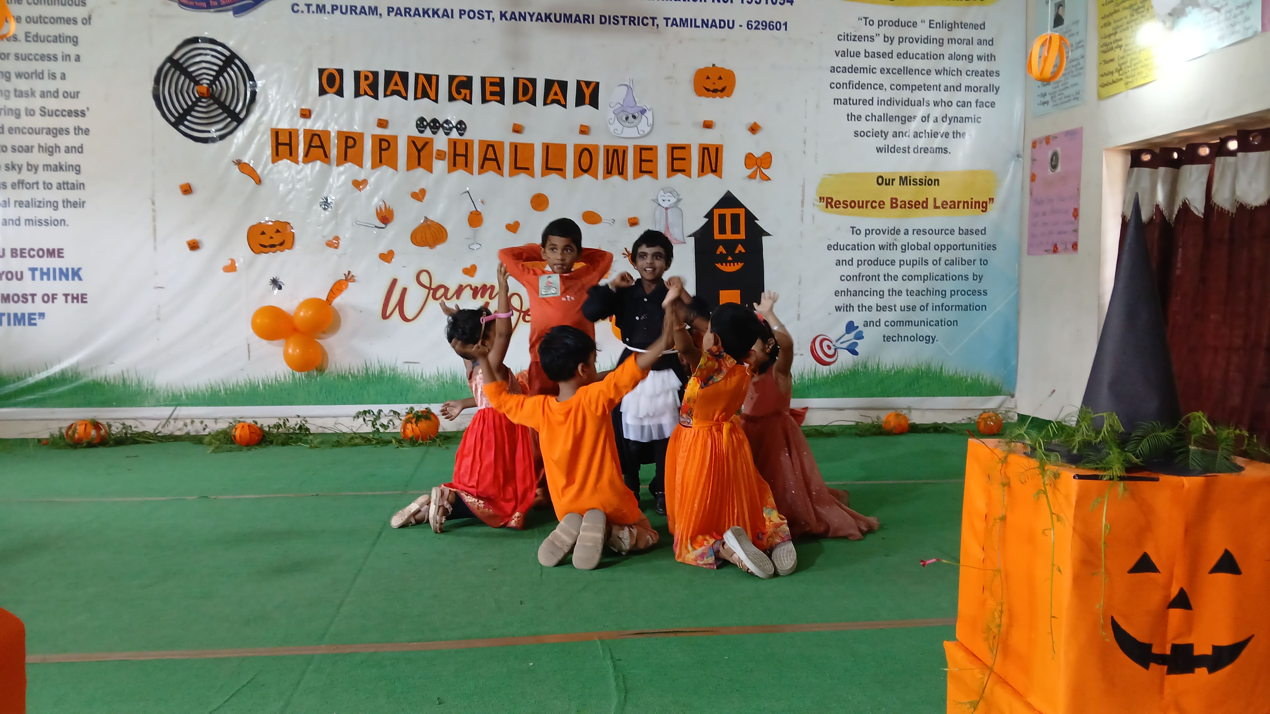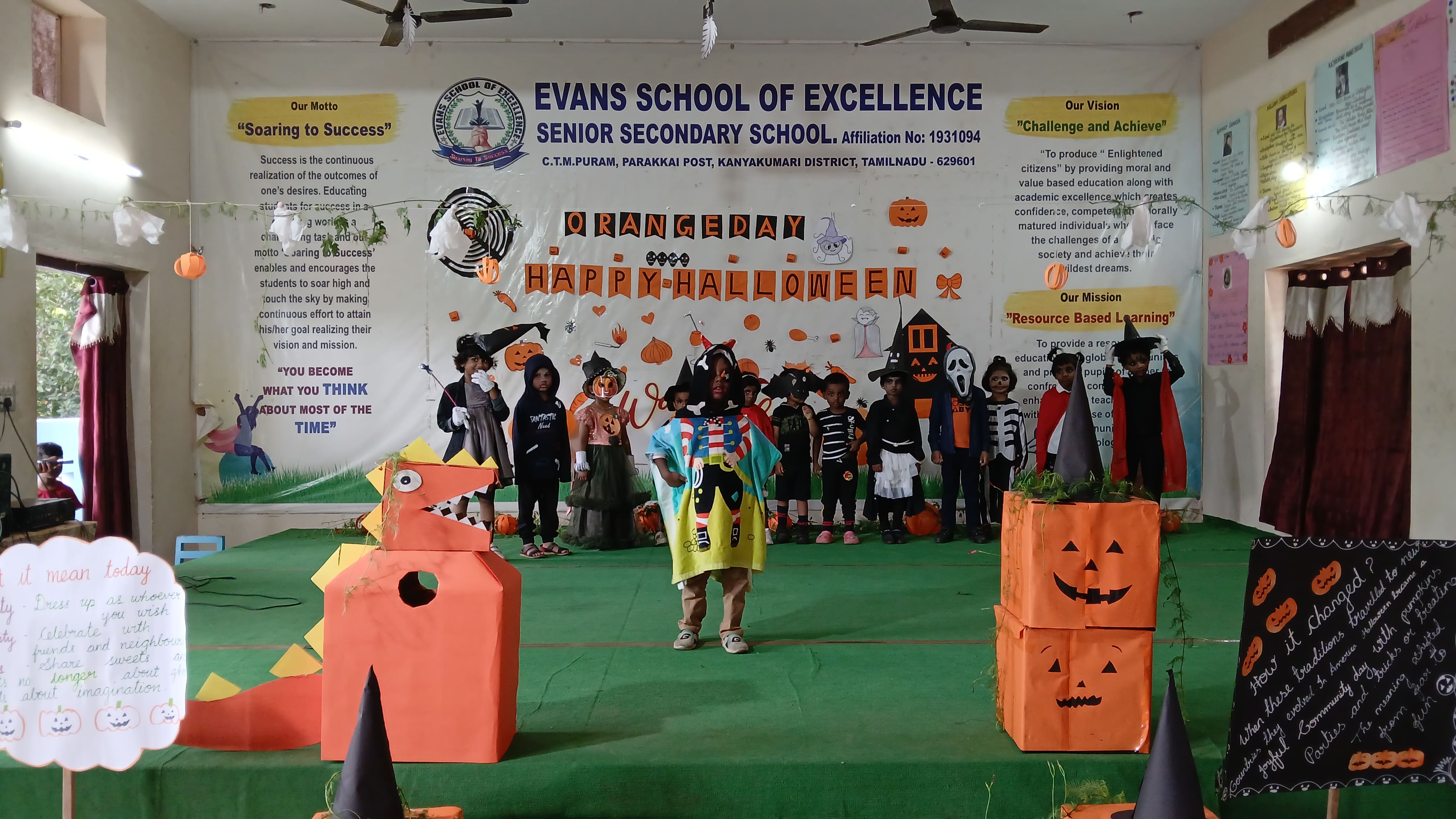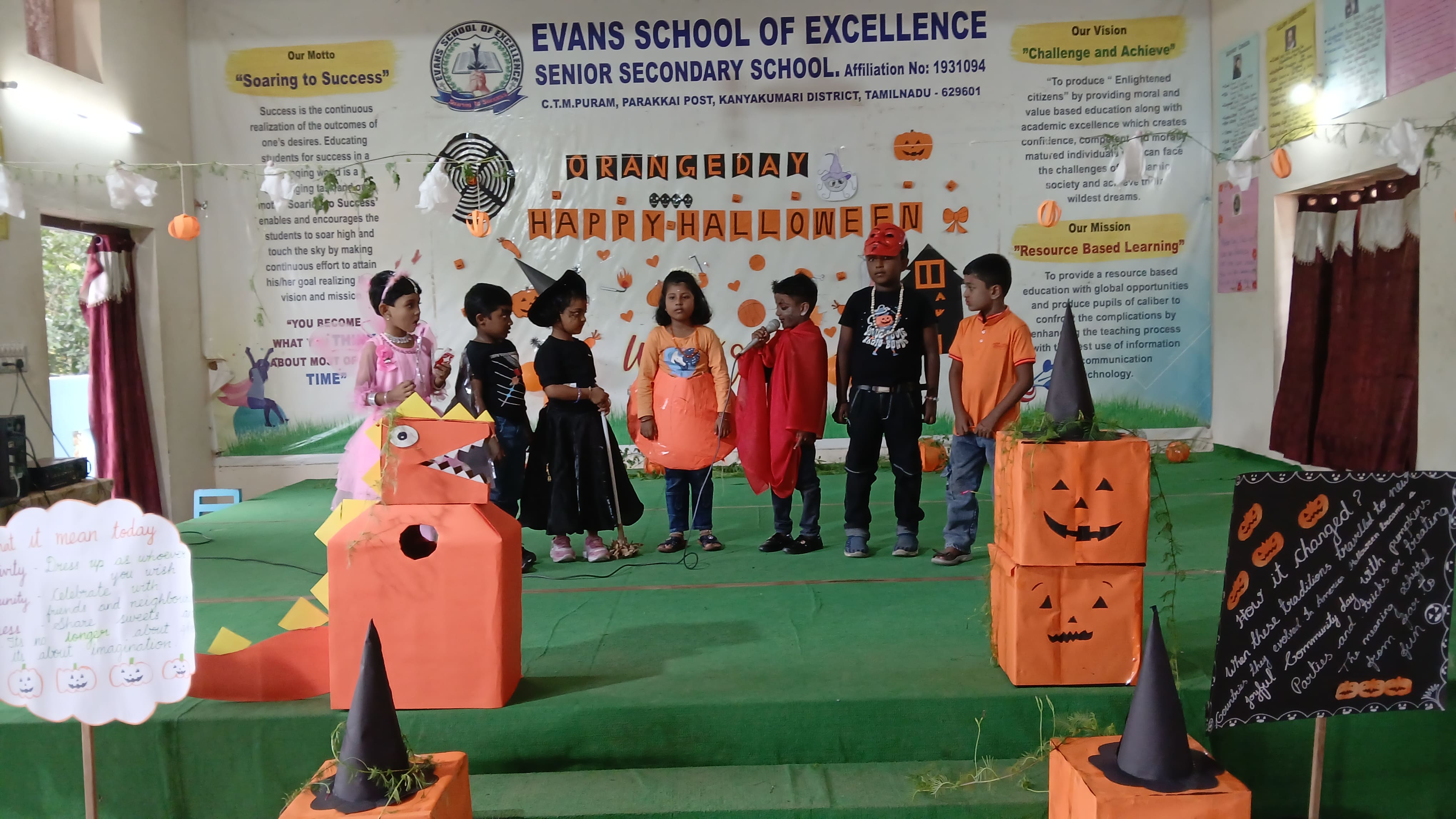"The Colour of Sunshine and smiles took over as our little Evansians celebrated Orange Day"&"Bag of sweets,ghosts are walking down the street"
