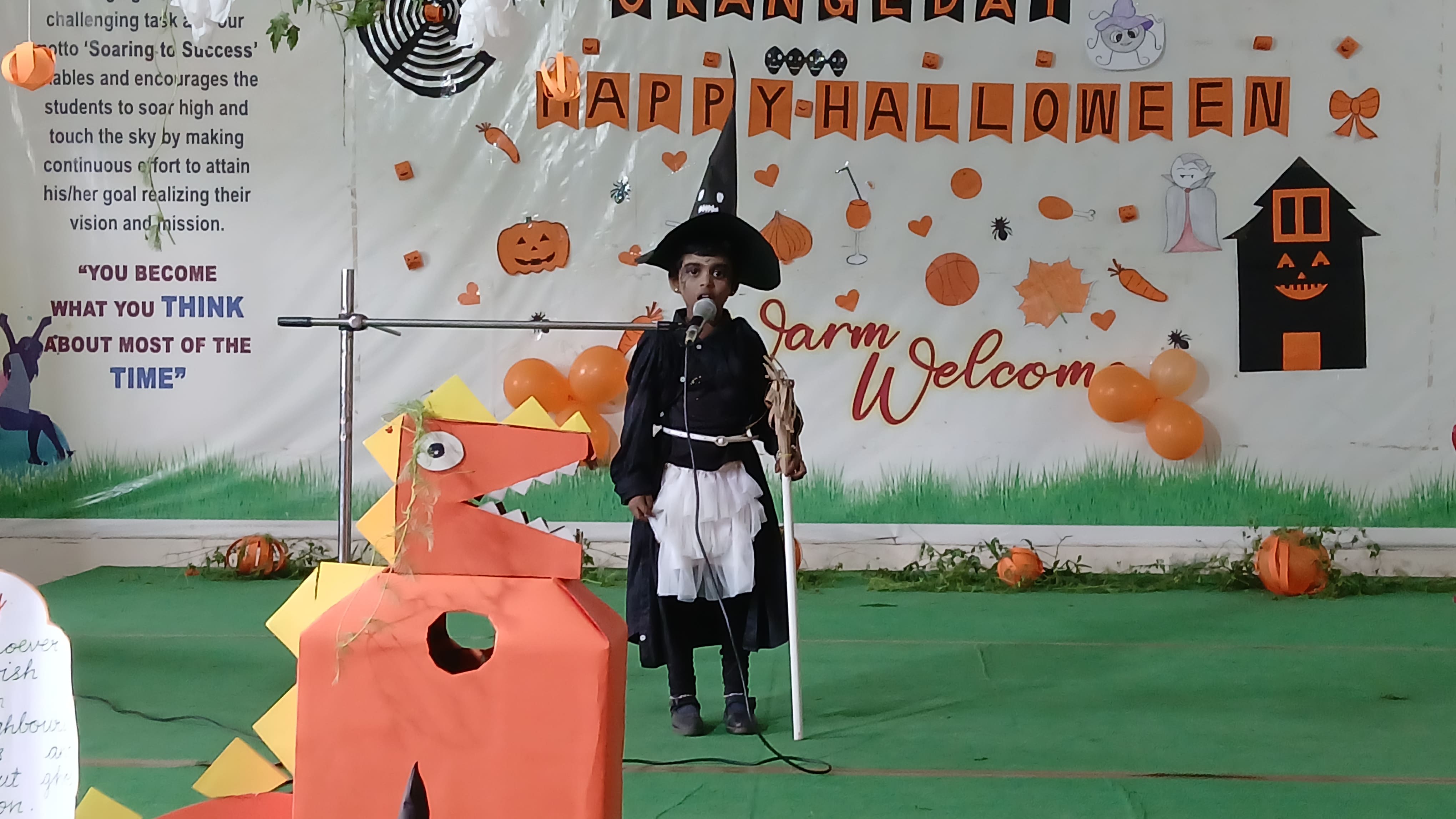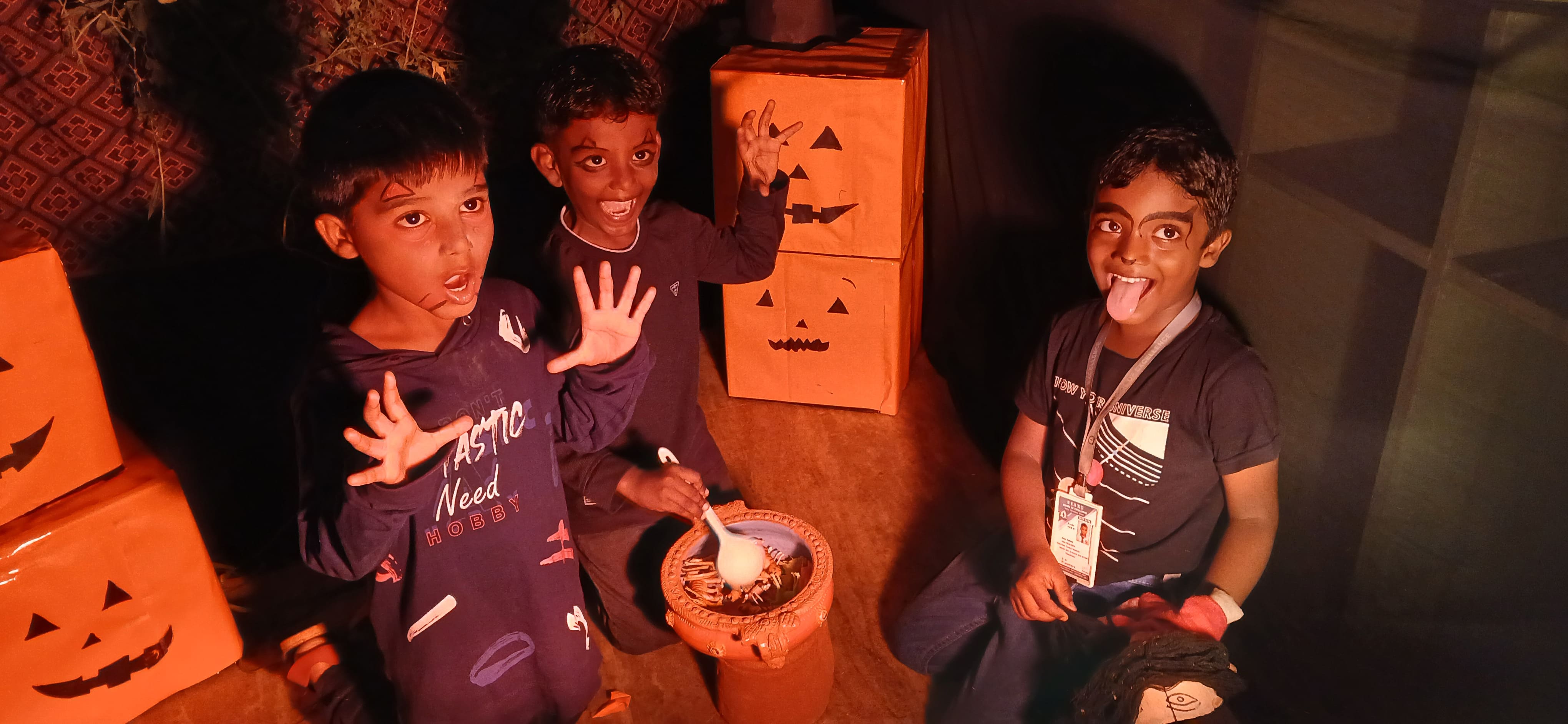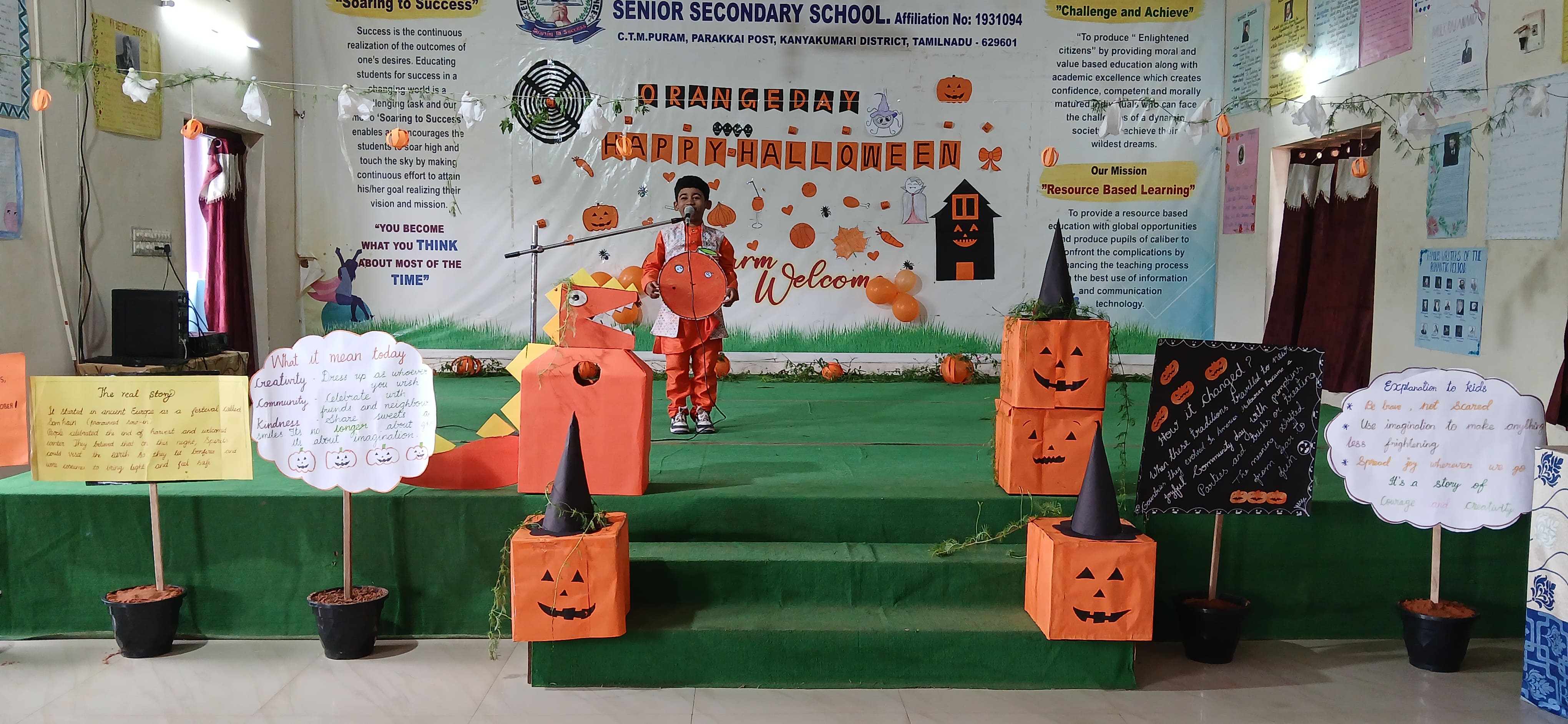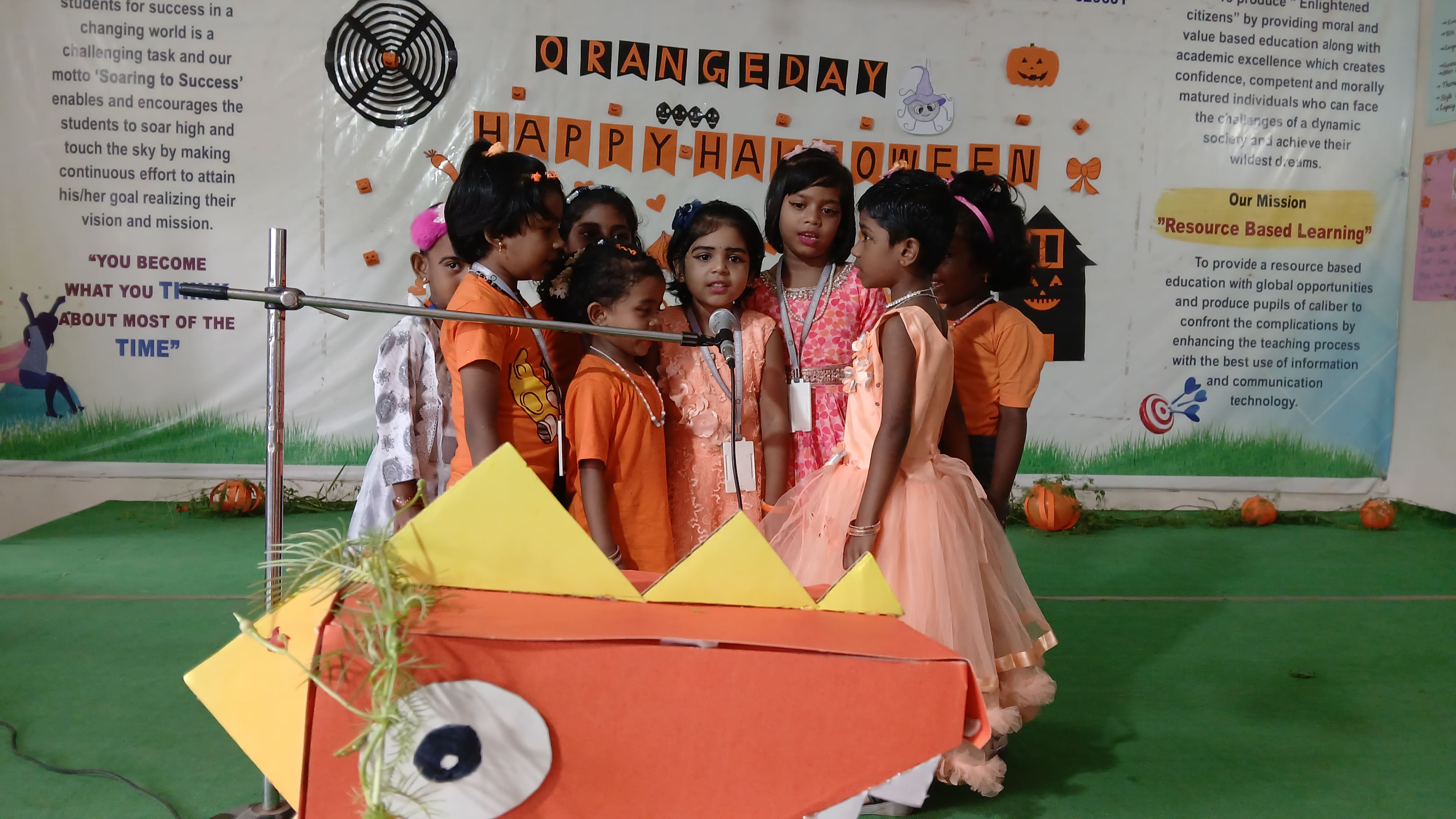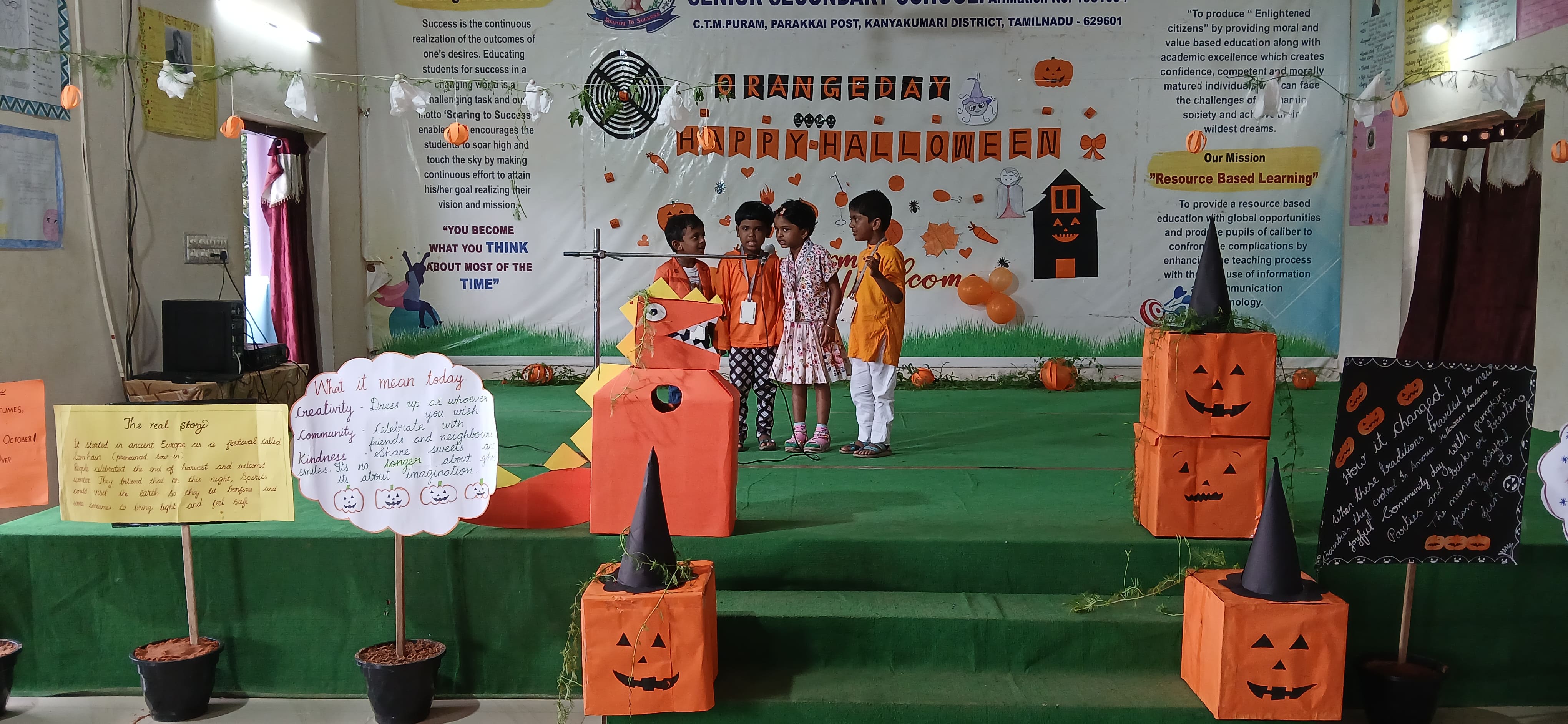 "The Colour of Sunshine and smiles took over as our little Evansians celebrated Orange Day"&"Bag of sweets,ghosts are walking down the street"