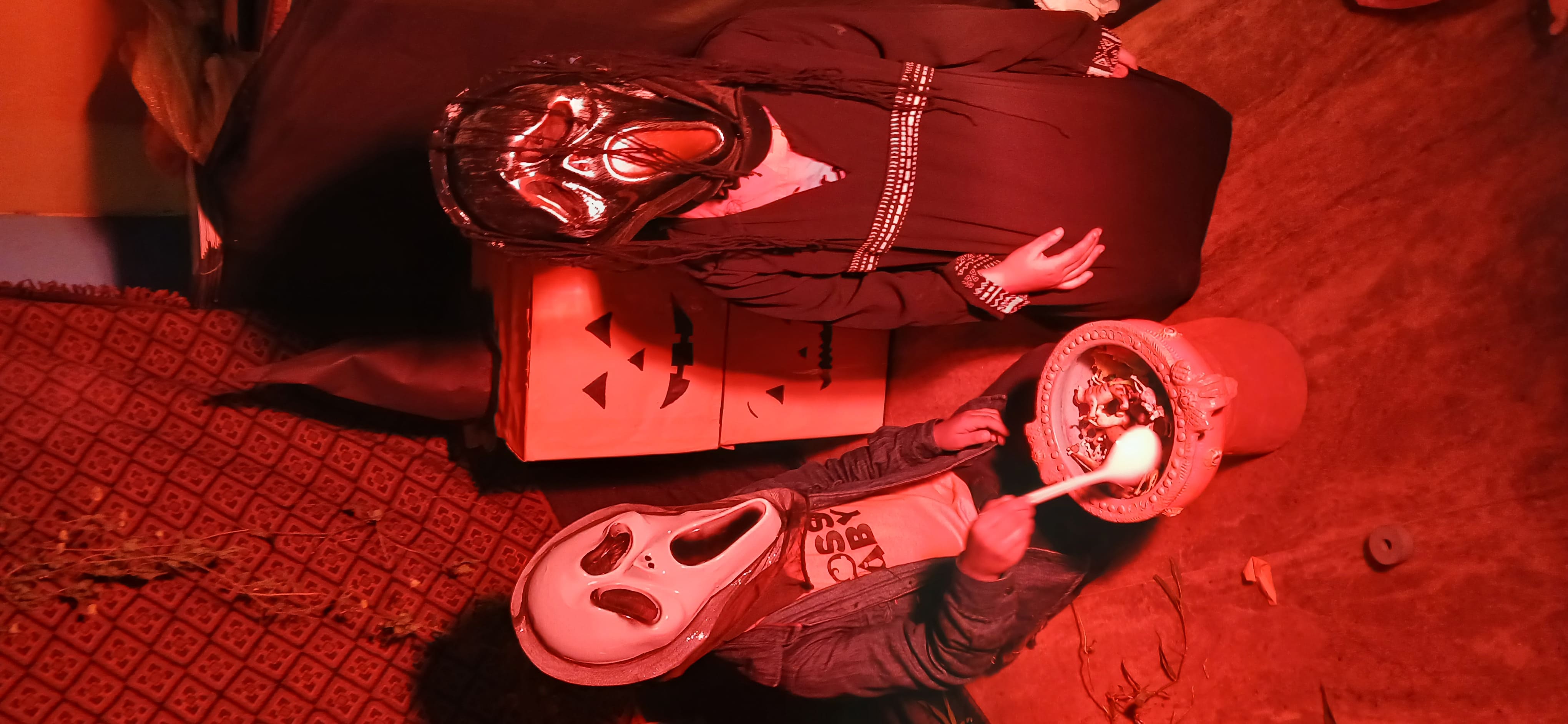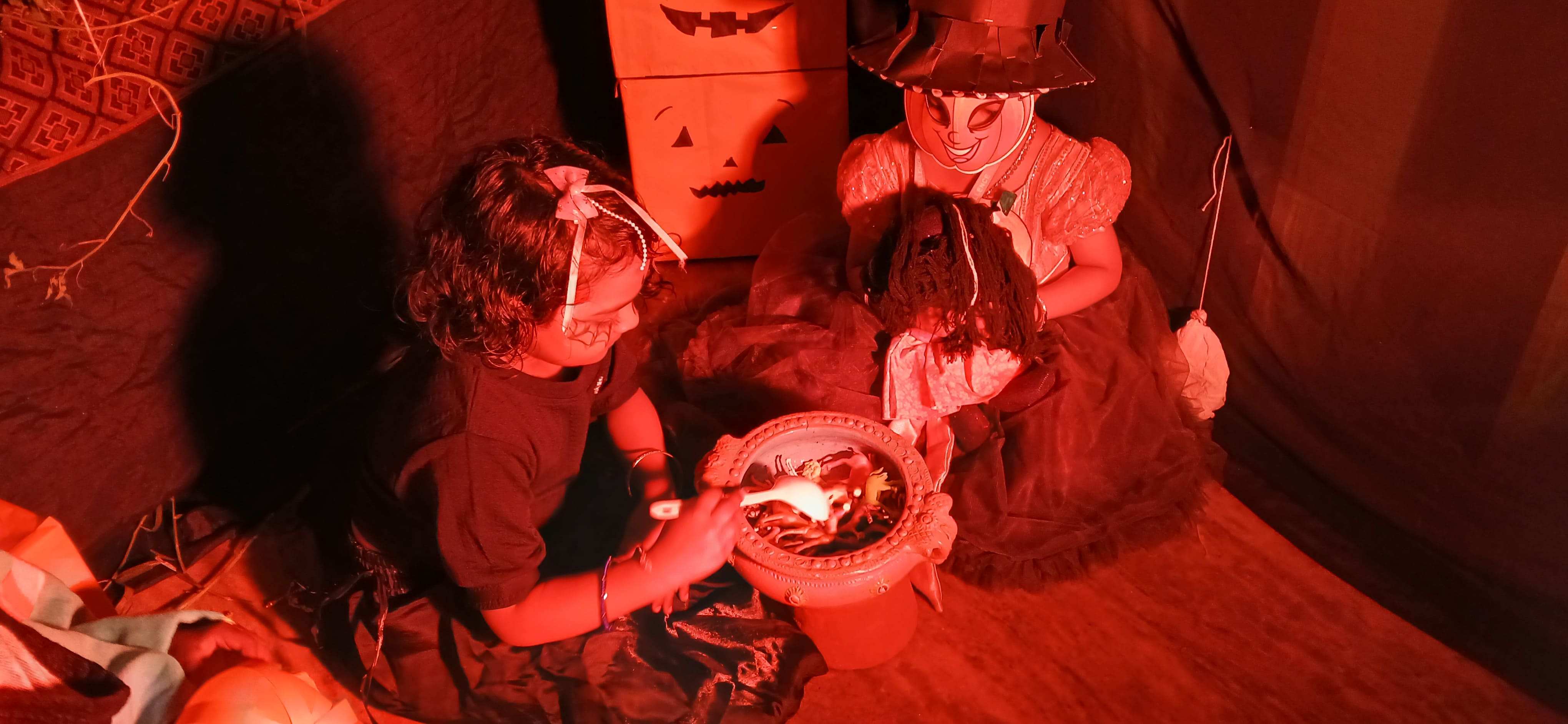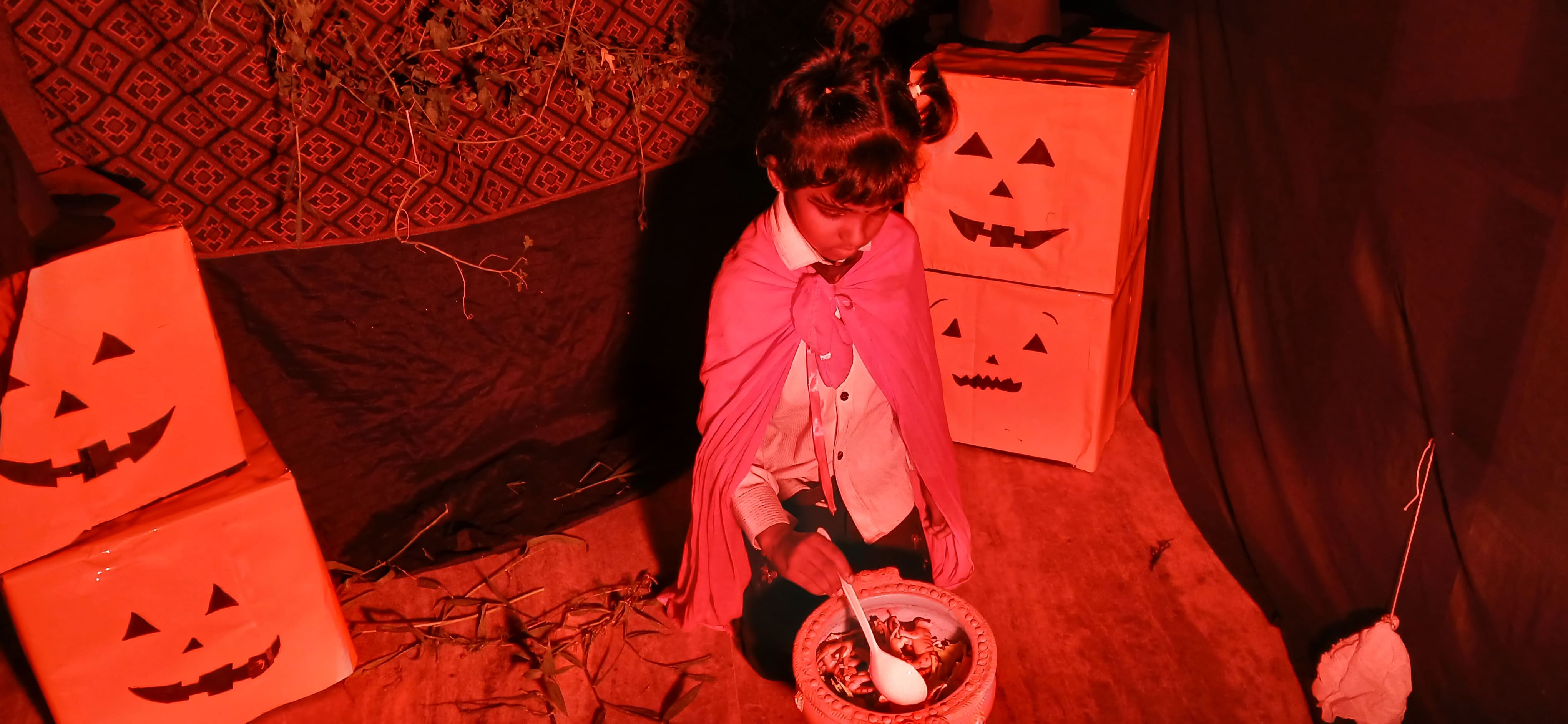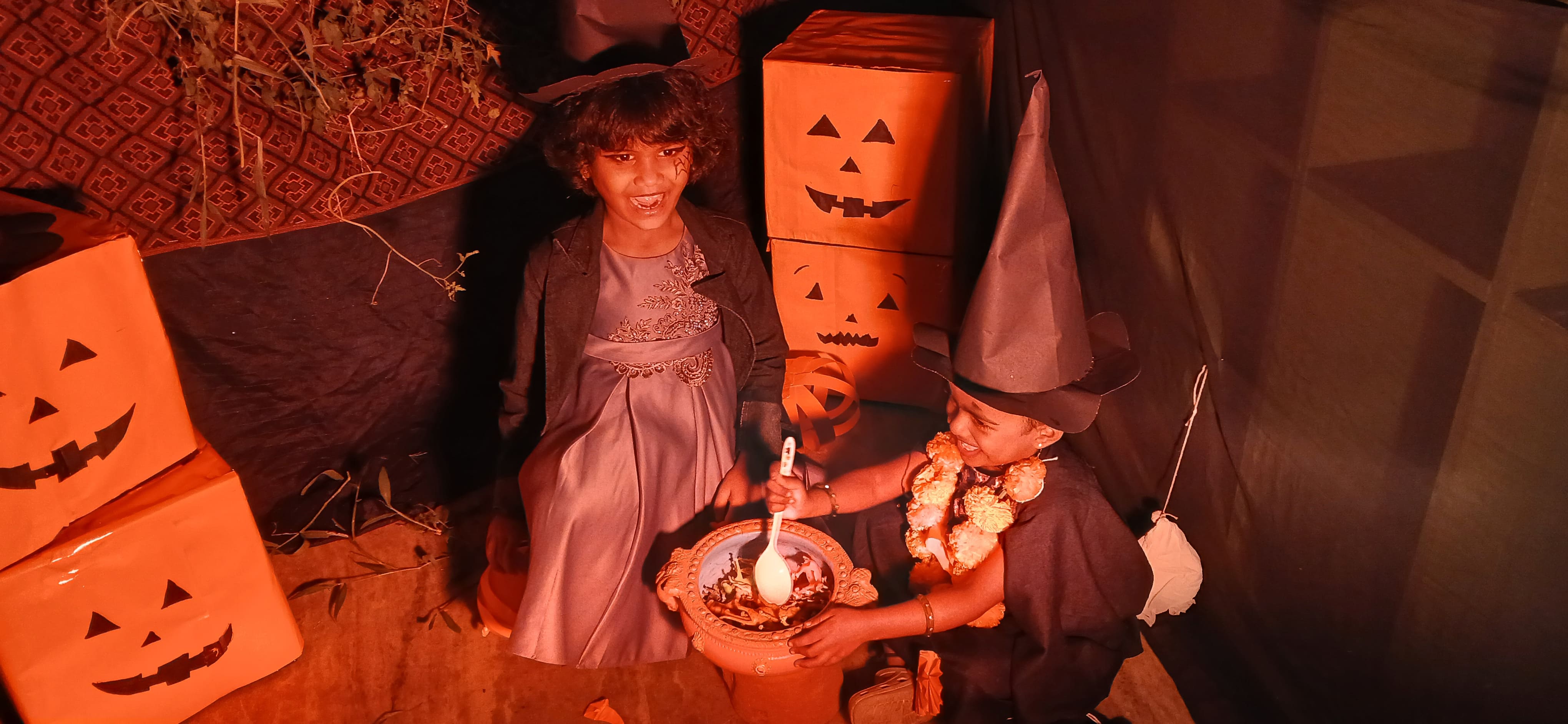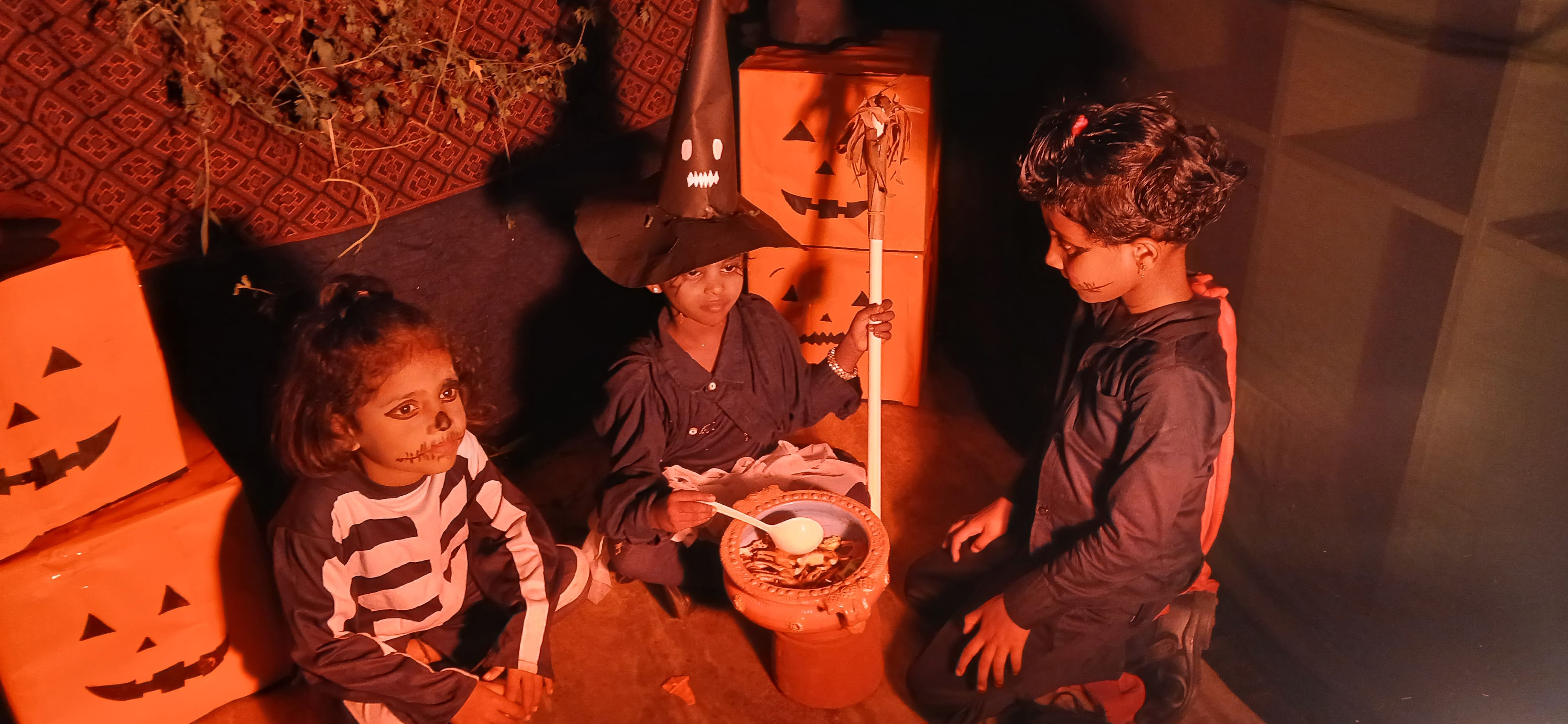 "The Colour of Sunshine and smiles took over as our little Evansians celebrated Orange Day"&"Bag of sweets,ghosts are walking down the street"